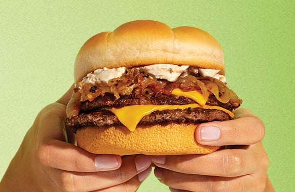 A&W’s French Onion Double Cheeseburger includes two beef patties layered with melted American cheese and topped with grilled onions and Boursin herb spread on a lightly toasted bun.