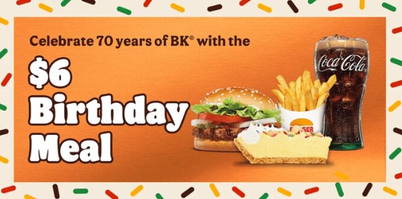 In celebration of its 70th anniversary, Burger King is rolling out a new $6 Birthday Meal deal, exclusively to BK Rewards members via the BK App or online at bk.com.