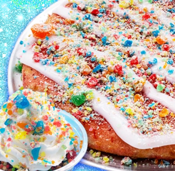 The Summer Dessert Pizza is a personal-sized pizza that comes smothered with a tasty strawberry topping, then sprinkled with Sour Patch Kids candy bits, and finished with a drizzle of white icing.