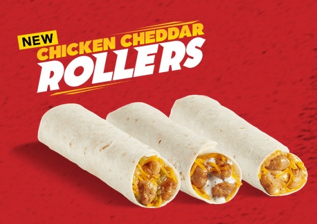 Del Taco’s new Chicken Cheddar Rollers come filled with freshly grilled, marinated chicken, freshly grated cheddar cheese, and your choice of tangy green sauce (Original), creamy ranch sauce or chipotle sauce, rolled in a warm flour tortilla for a suggested price of $1.29.