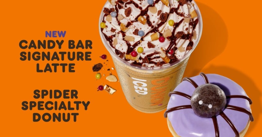 Dunkin’ is serving up sweet memories this Halloween with the new Candy Bar Signature Latte and the return of the Spider Donut and Halloween MUNCHKINS Bucket, available at participating locations starting October 15, 2025.