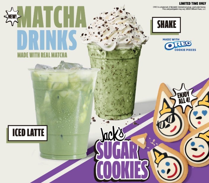 Jack in the Box hops on the matcha trend with the introduction of a new matcha beverage lineup, including the Matcha Latte and Oreo Matcha Shake, at participating locations.