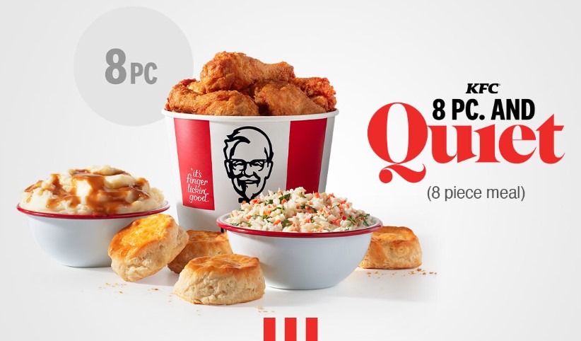 - Eight Piece and Quiet Meal – For the Mom Who Wants to Keep the Day Easy: Eight pieces of the brand’s world-famous chicken in your choice of Original Recipe or Extra Crispy, paired with two large sides and four extra buttery biscuits.