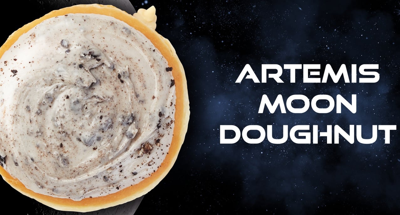 The Artemis Moon Doughnut features a cheesecake Kreme flavored filled donut dipped in Cookies ‘n Kreme Icing with a swirl of cookie pieces.