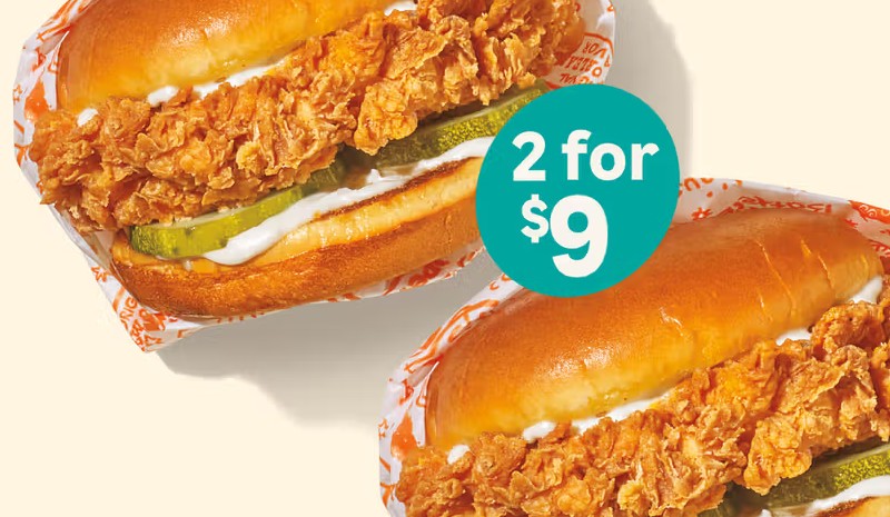 Popeyes is offering a digital‑exclusive deal where anyone can get any two chicken sandwiches, excluding Bacon & Cheese, for $9 at participating locations through January 4, 2026.