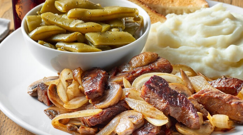 The Prime Rib Tips Dinner consists of tender prime rib tips, grilled sauteed mushrooms and caramelized onions, paired with savory au jus sauce, your choice of two sides and a buttery, fluffy biscuit or Texas Toast.