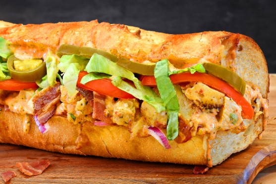 Quiznos’ Club Peri Peri Sandwich features grilled chicken, bacon, lettuce, tomatoes, red onions, jalapenos, melted cheese, and creamy peri-peri sauce, all served on Italian white bread.